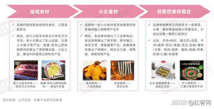 在聚焦突出“鲜”属性之外,为了进一步实现食材升级,打造差异化优势,还有不少烧烤品牌另辟蹊径,从地域特色食材或者小众食材、跨赛道食材入手,推出多款新奇产品。