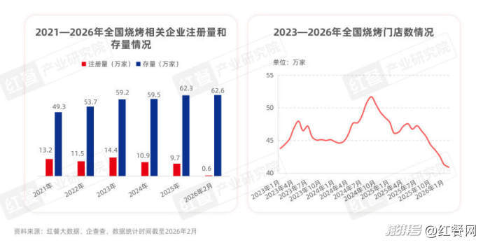 在市场规模呈现增长趋势的同时,烧烤赛道的竞争态势依然十分激烈。这一点,在烧烤门店数量的变化上表现得尤为突出。企查查数据显示,2023年1月至2026年2月,全国烧烤门店呈先升后降趋势,于2024年9月达到峰值51.7万家。然而,截至2026年2月,全国烧烤门店数量已降至40.9万家,较2024年9月下降了20.9个百分点。